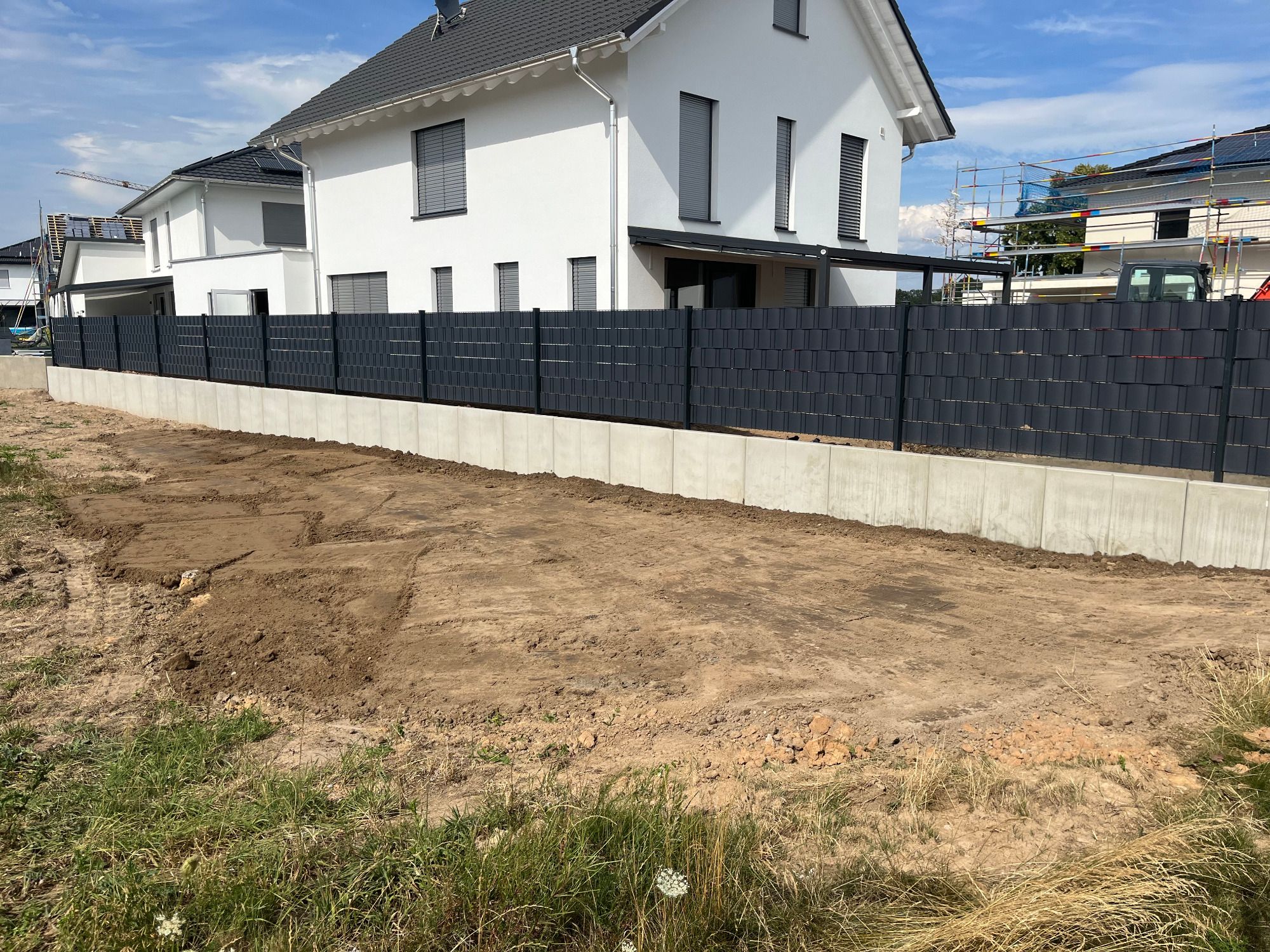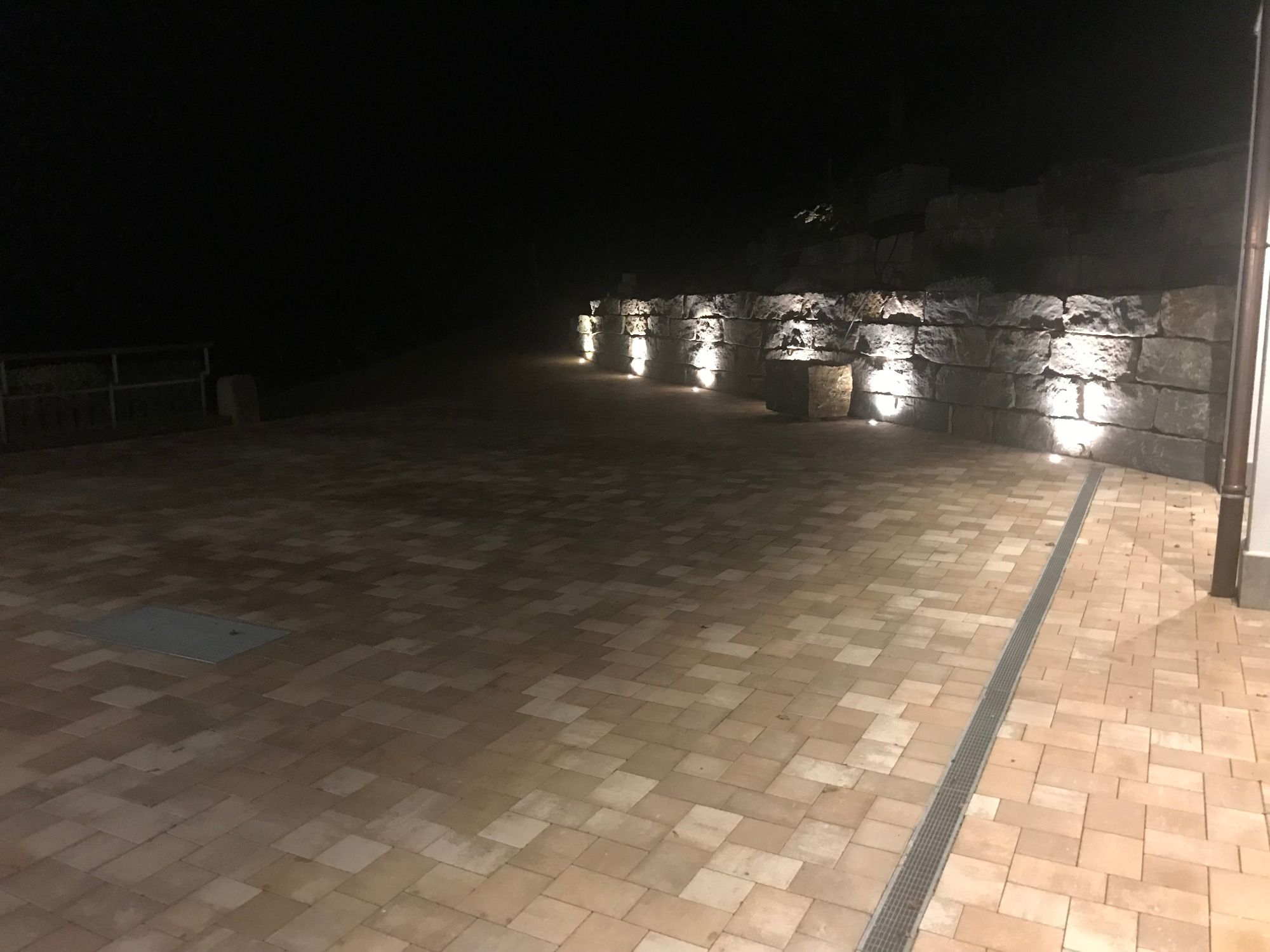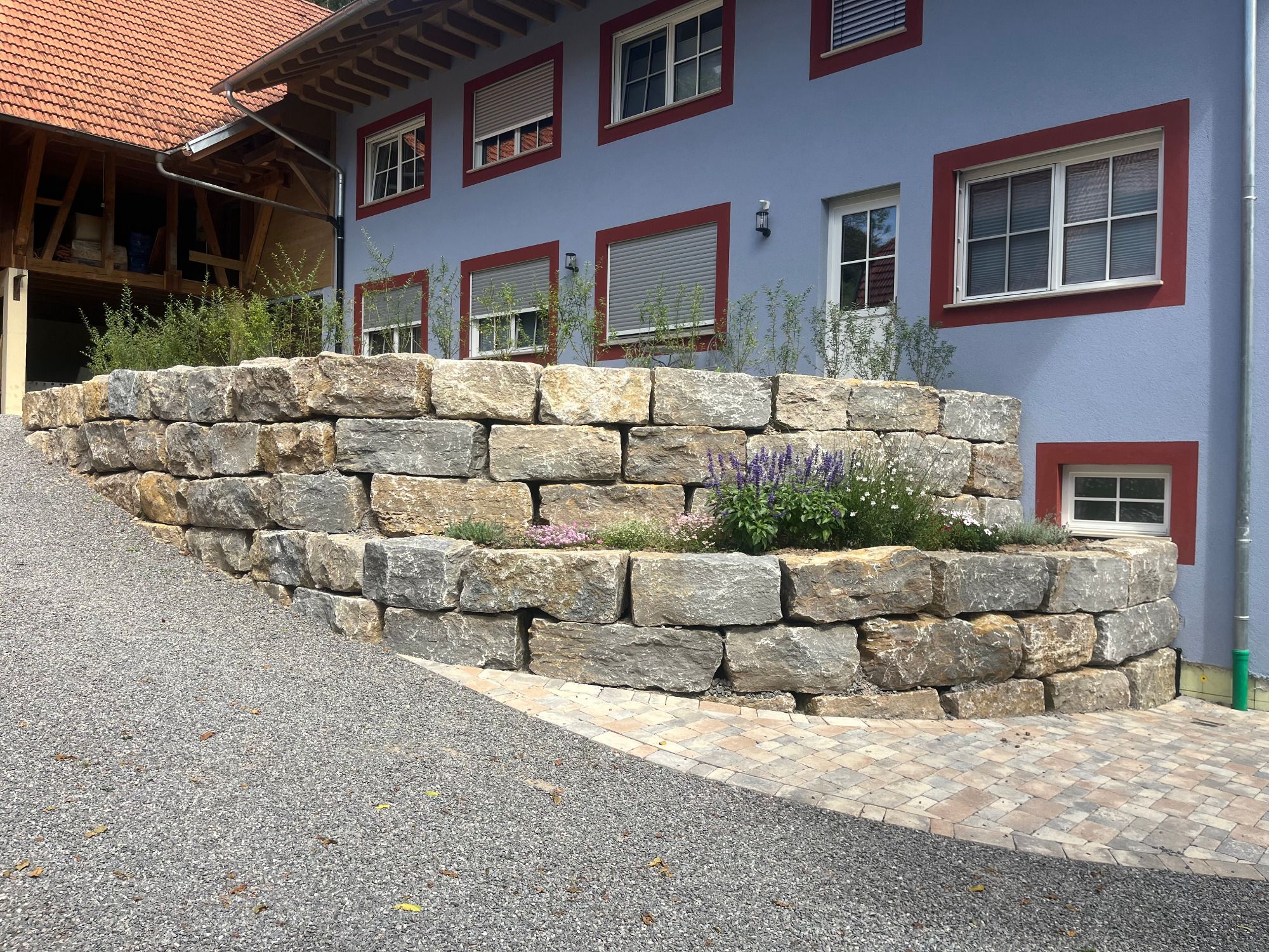 Außenanlage mit Muschelkalkquader und Pflasterarbeiten